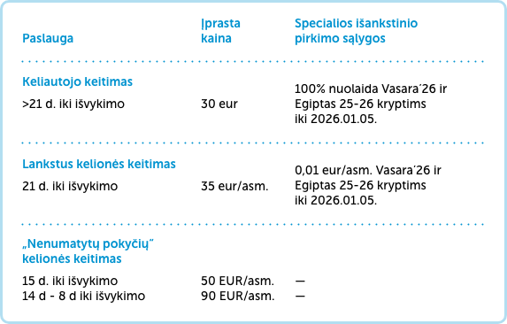 - Papildoma paslauga teikiama, jei keliautojas neužsisakė „Lankstaus kelionės keitimo“ paslaugos, bet nori pakeisti išvykimo datą, kelionės trukmę, viešbutį, kambario tipą, kryptį.