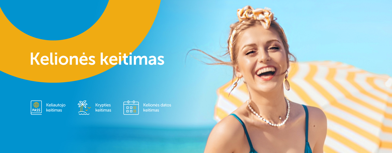 - Papildoma paslauga leidžia vieną kartą per rezervacijos laikotarpį pakeisti vieno keliautojo vardą ir pavardę, išvykimo datą, kelionės trukmę, viešbutį, kambario tipą ir kryptį, bet ne vėliau kaip likus 21 dienai iki išvykimo